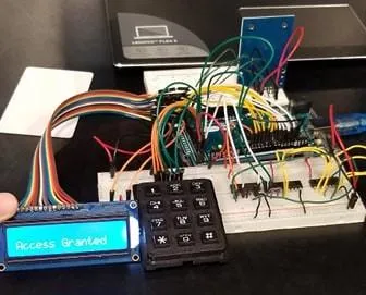 A breadboard circuit using an Arduino, a keypad, an RFID scanner, an LCD screen, and basic logic gates to create a simple security system.